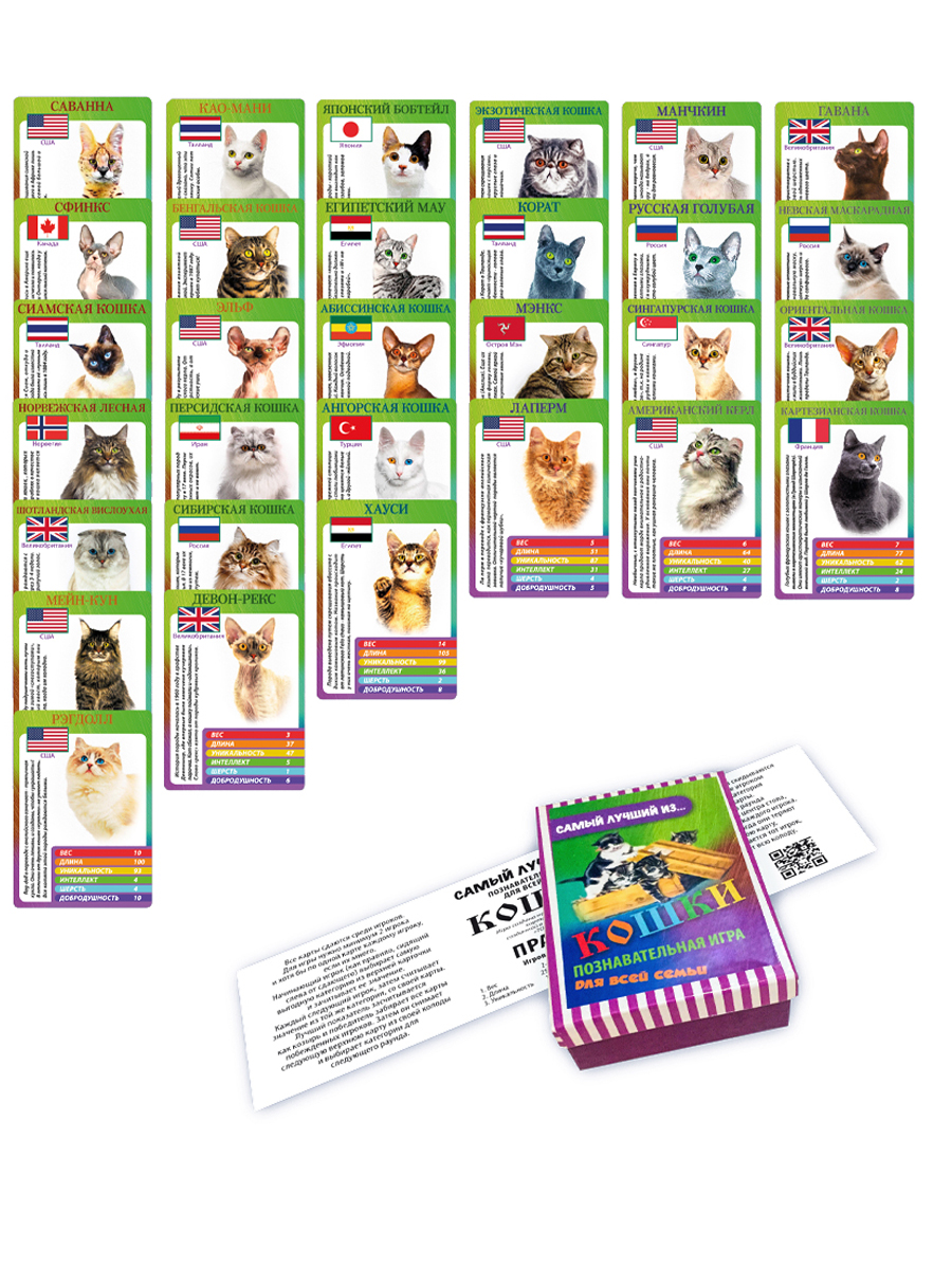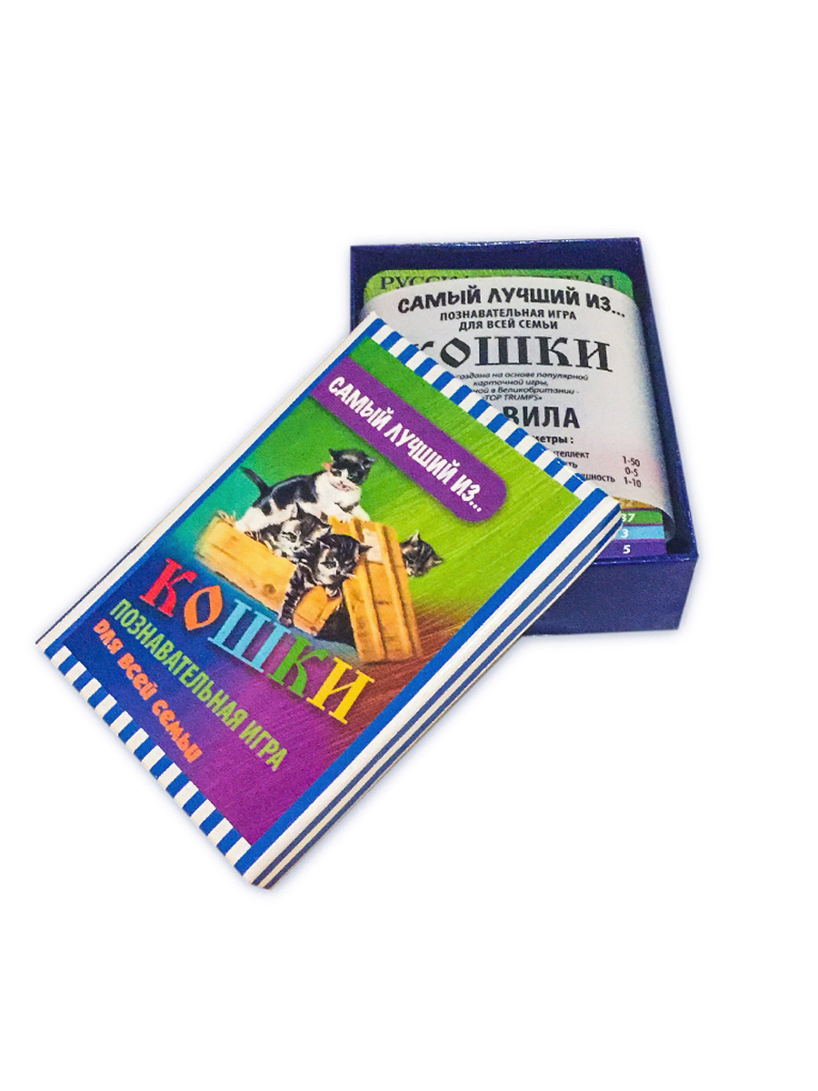 Очень простая, динамичная и познавательная карточная игра о кошках. В комплект игры входят 30 красивых и красочных карточек с описанием самых интересных фактов о некоторых популярных породах кошек. Играя в эту игру, вы узнаете много нового и интересного о любимых питомцах. На каждой карте из колоды есть шесть характеристик кошек : вес, длина, уникальность, интеллект, шерсть, добродушность. Задача игрока заключается в том, чтобы понять по какому из параметров его карточка лучше, чем карточка соперника. В случае, если он угадал, то все остальные игроки отдают ему свои карты. Задача заключается в том, чтобы собрать всю колоду! В игру можно играть компанией от 2-х человек. Возраст не имеет значения!