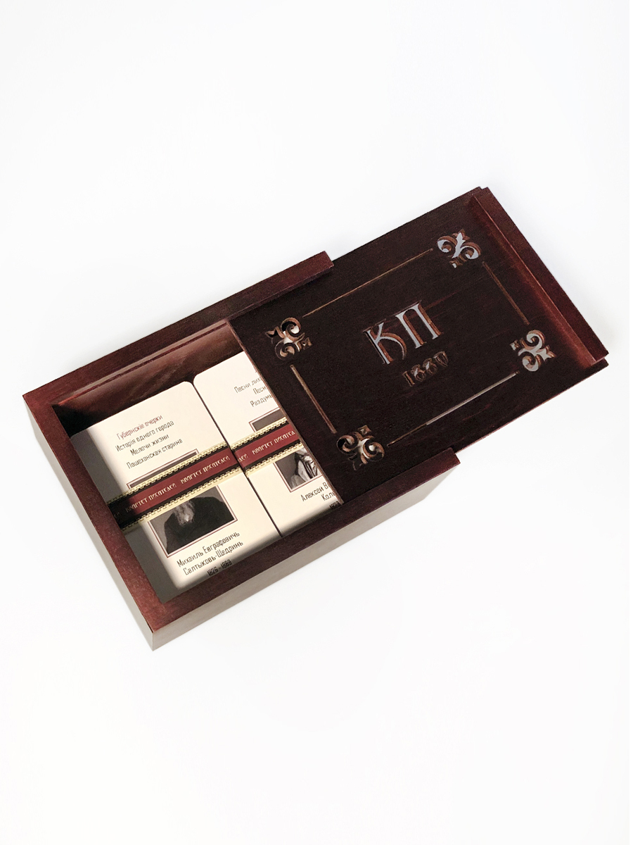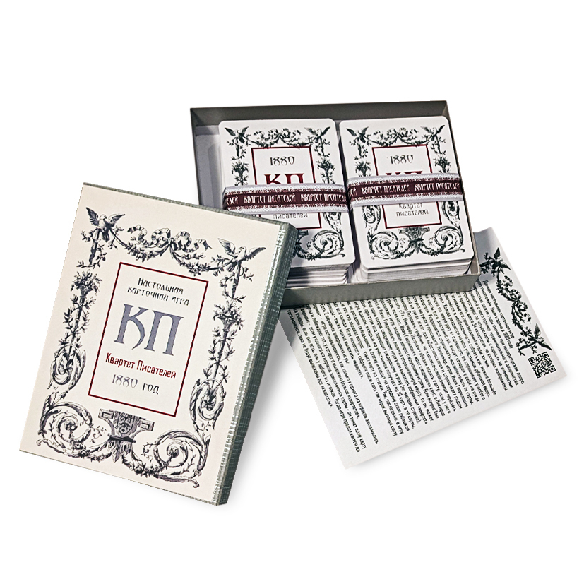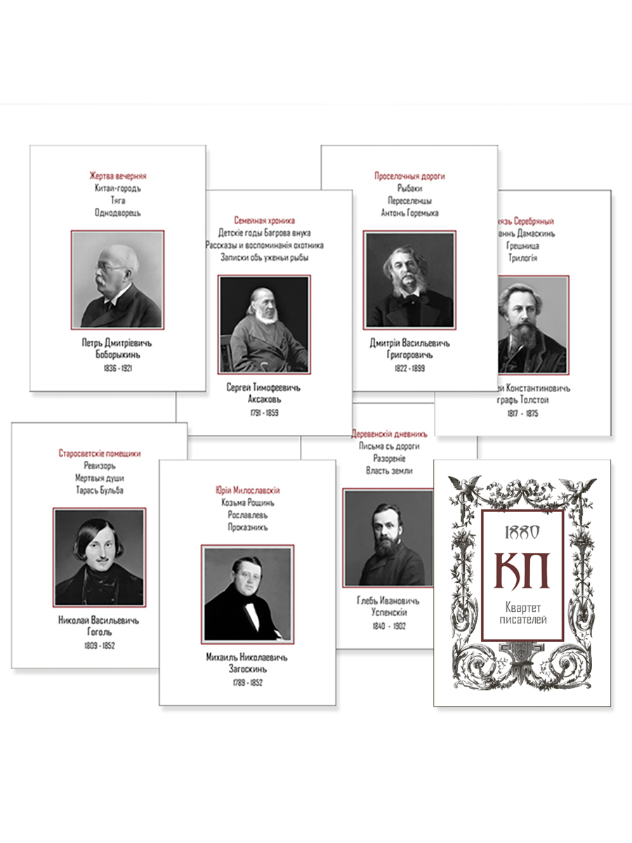 Колода карт, состоящая из 134 листов, в нее входит по четыре карты с изображением знаменитых российских писателей и поэтов того времени с годами их жизни, а так же 4 названия написанных ими самых популярных произведений. Это 34 квартета