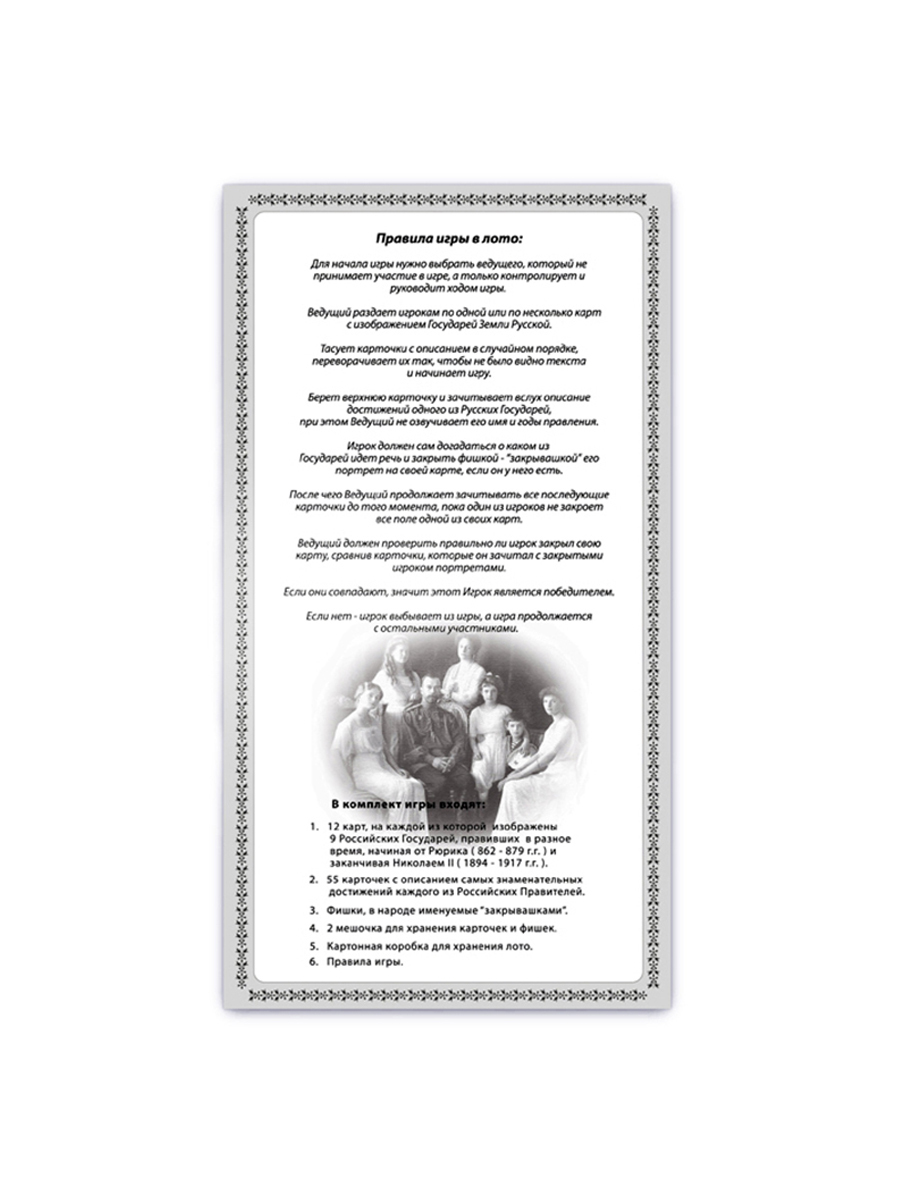 Наше Историческое лото с портретами Государей Земли Русской было изготовлено на основе игры, разработанной в 1897 году. В комплект Исторического лото входят: