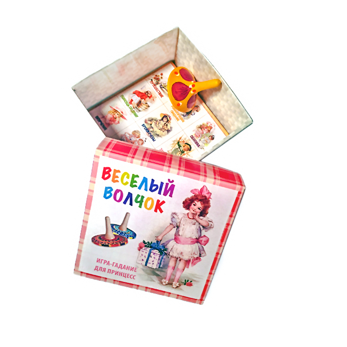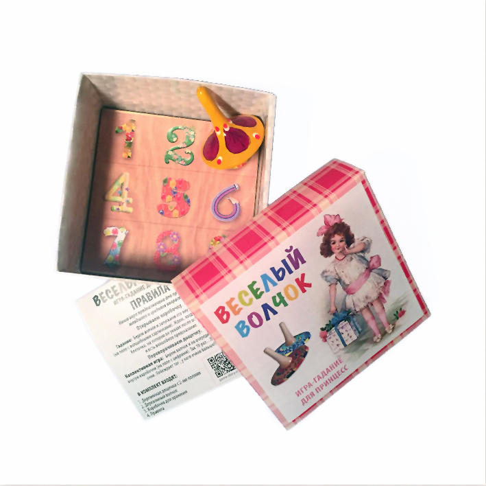 Игра “Веселый волчок” предназначена для “принцесс” младшего и среднего возраста. При помощи нашей игрушки девочки смогут, вращая в коробочке волчок, гадать, что он им предскажет – путешествие, встречу с подругой, занятие спортом, учебой, помощь по дому, огорчение, обновку, развлечения или романтическое свидание? С другой стороны деревянной дощечки нарисованы квадратики с забавными цифрами от 1 до 9. Запуская Веселый волчок, можно устроить коллективную игру с друзьями – кто наберет больше очков! В комплект входят: