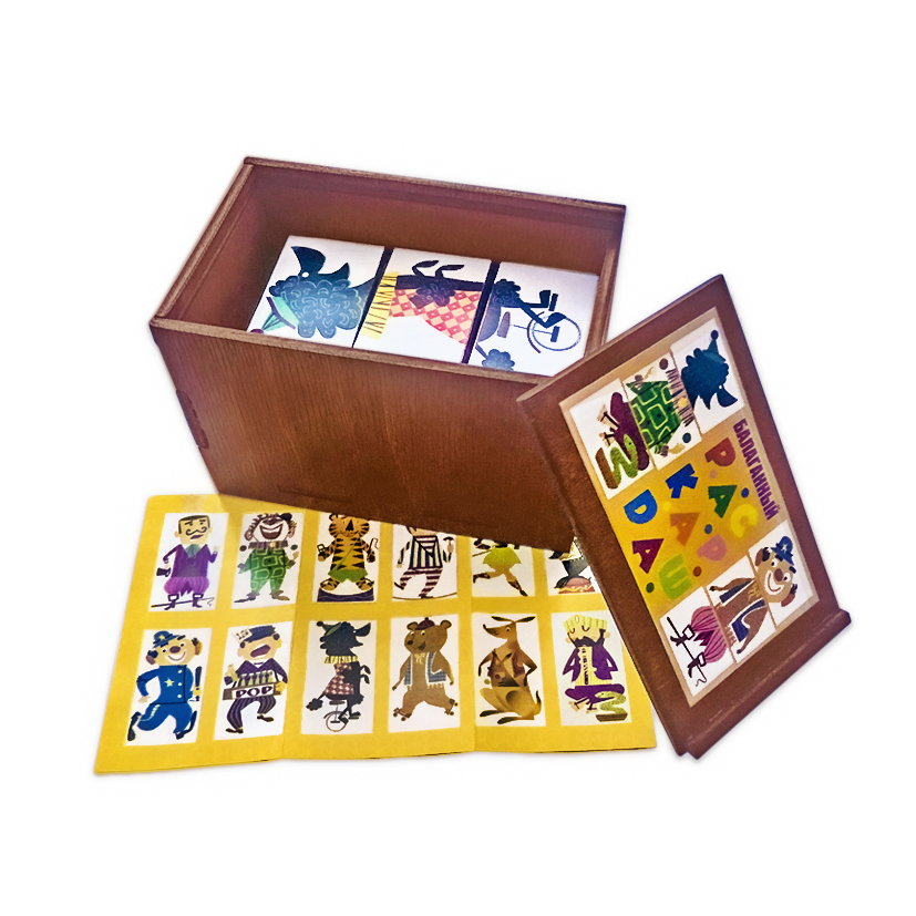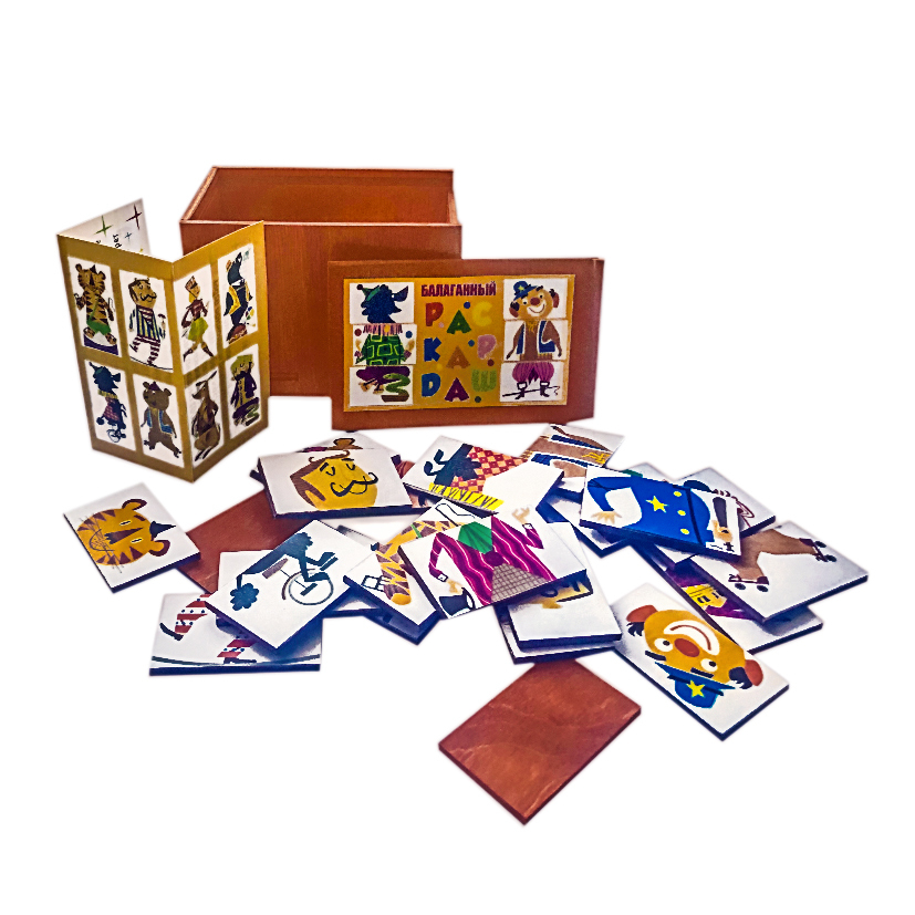 Игра “БАЛАГАННЫЙ РАСКАРДАШ” создана на основе американской игры “Mixies”, впервые изданной в 1956 году. Это забавная карточная игра в стиле головоломки состоит из 36-ти деревянных блоков (пазлов), из которых можно собирать до 1001 смешных цирковых фигурок. В комплект игры входят: