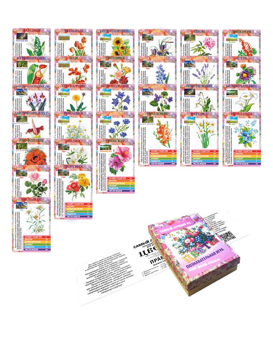 Очень простая, динамичная и познавательная карточная игра о цветах. В комплект игры входят 30 красивых и красочных карточек с описанием самых интересных фактов о некоторых популярных цветах. Играя в эту игру, вы узнаете много нового и интересного о любимых растениях. На каждой карте из колоды есть шесть характеристик цветов : размер соцветия, высота, время цветения, аромат, редкость и число видов. Задача игрока заключается в том, чтобы понять по какому из параметров его карточка лучше, чем карточка соперника. В случае, если он угадал, то все остальные игроки отдают ему свои карты. Задача заключается в том, чтобы собрать всю колоду! В игру можно играть компанией от 2-х человек. Возраст не имеет значения!