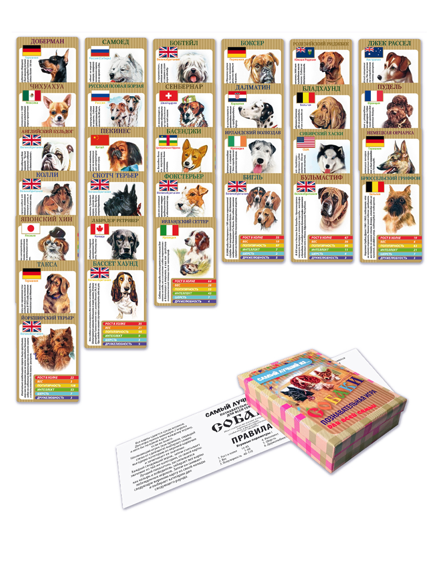 Очень простая, динамичная и познавательная карточная игра о собаках. В комплект игры входят 30 красивых и красочных карточек с описанием самых интересных фактов о некоторых популярных породах собак. Играя в эту игру, вы узнаете много нового и интересного о любимых питомцах. На каждой карте из колоды есть шесть характеристик собак : рост в холке, вес, популярность, интеллект, шерсть, дружелюбность. Задача игрока заключается в том, чтобы понять по какому из параметров его карточка лучше, чем карточка соперника. В случае, если он угадал, то все остальные игроки отдают ему свои карты. Задача заключается в том, чтобы собрать всю колоду! В игру можно играть компанией от 2-х человек. Возраст не имеет значения!